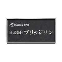 立体的な装飾枠を付けることで重厚感が増し、品の良い看板です。装飾枠の幅は通常10mmで、表示面より8mm程度の立ち上がりがあります。表示部分はエッチングにより凹凸(約0.3mm)が付きますので、経年劣化により色が剥がれても表示の可読性を保てることが特徴で、耐候性もある商品です。梨地の有無、反転の文字凹表示も同価格で承ります。